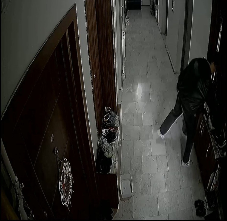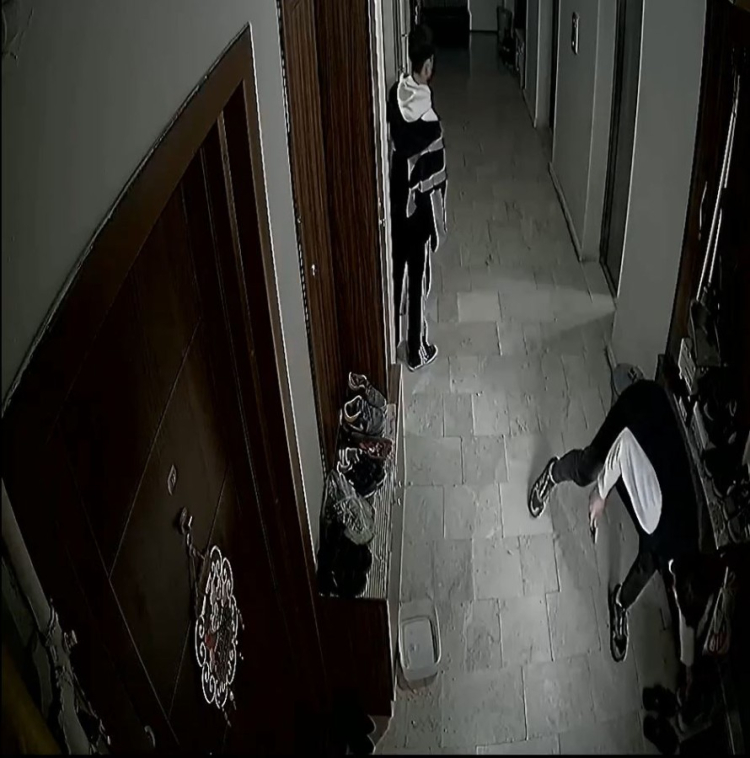 Görüntülerde, apartmanda dolaşan 2 şüphelinin merdiveni kullanarak üst kata çıktığı, bir çift ayakkabıyı aldıktan sonra, aynı daire önünden ikinci ayakkabıyı almaya çalıştığı sırada, asansörden inen apartman sakinini görüp, koşarak merdivenlerden kaçtığı görüldü.