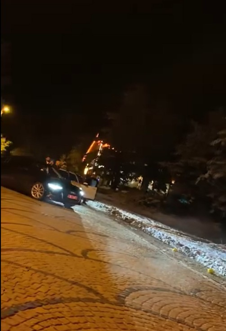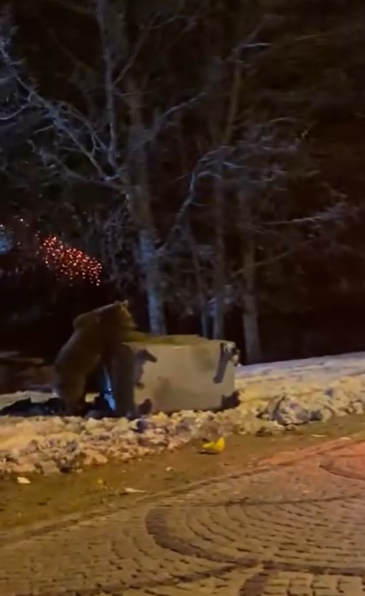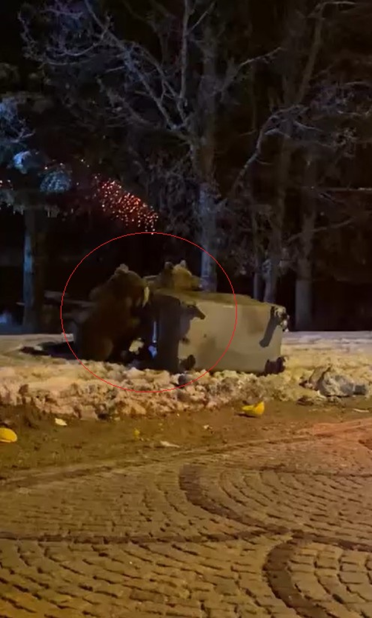 Bursa'da Uludağ yoluna çıkan bir grup, yol kenarındaki çöp konteynerinde yiyecek arayan ayılara kar topu attı. Kar topu gelince korkan hayvanlar, cep telefonuyla görüntülendi.