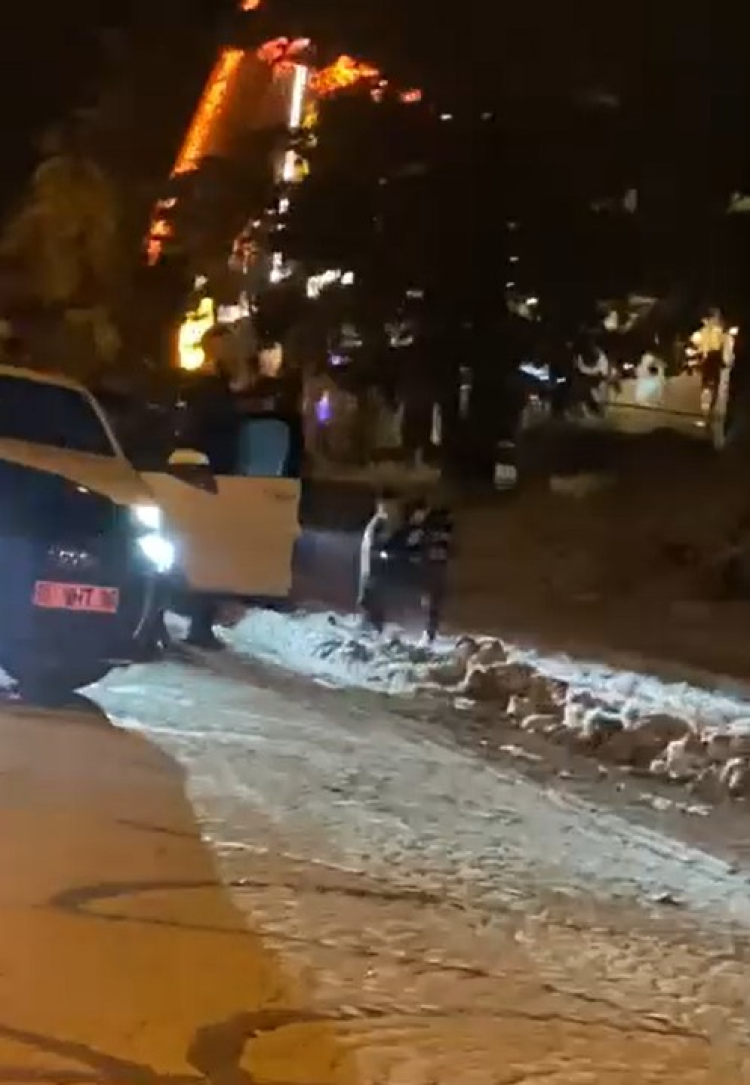 Bir vatandaş, ayıları cep telefonu kamerasıyla görüntülerken; otomobillerini yol ortasında durduran bir grup, yol kenarından topladıkları karları ayılara attı.