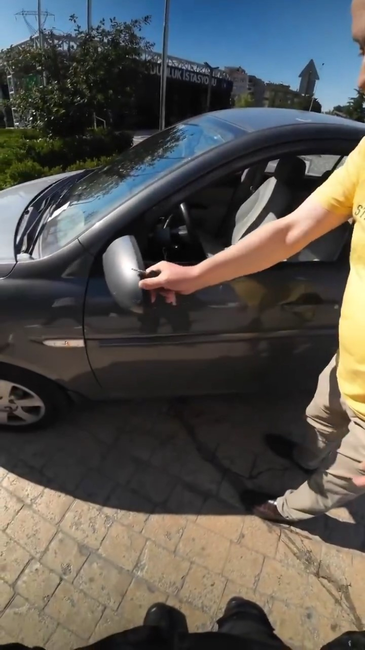 Ne olduğunu anlamayan motosiklet sürücüsü, otomobilin başına gitti. Otomobilin aynasının sallandığını gören motosiklet sürücüsü "ne zaman çarptığımı hatırlamıyorum kameram açık kayıtlara bakalım" dedi.