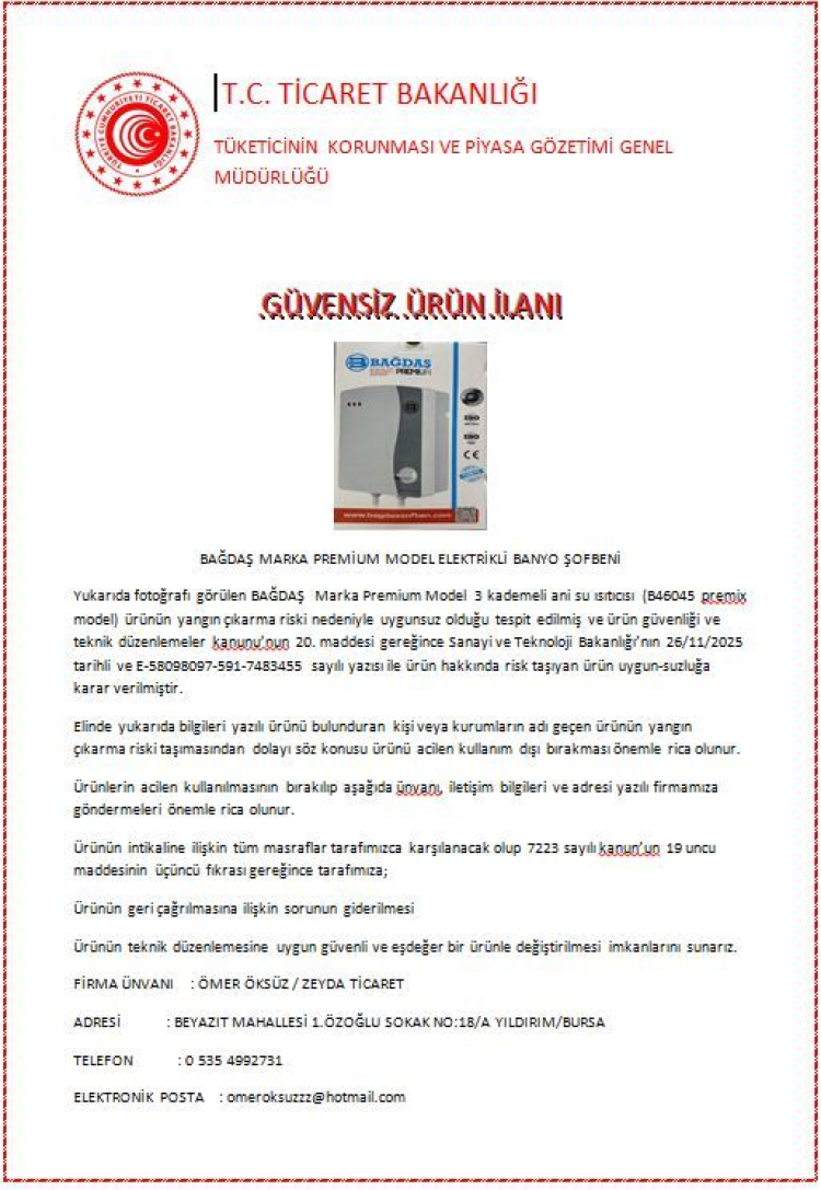 Ticaret Bakanlığı'na bağlı Tüketicinin Korunması ve Piyasa Gözetimi Genel Müdürlüğü,Bağdaş marka Premium model elektrikli banyo şofbeni hakkında toplatma kararı alındığını duyurdu.