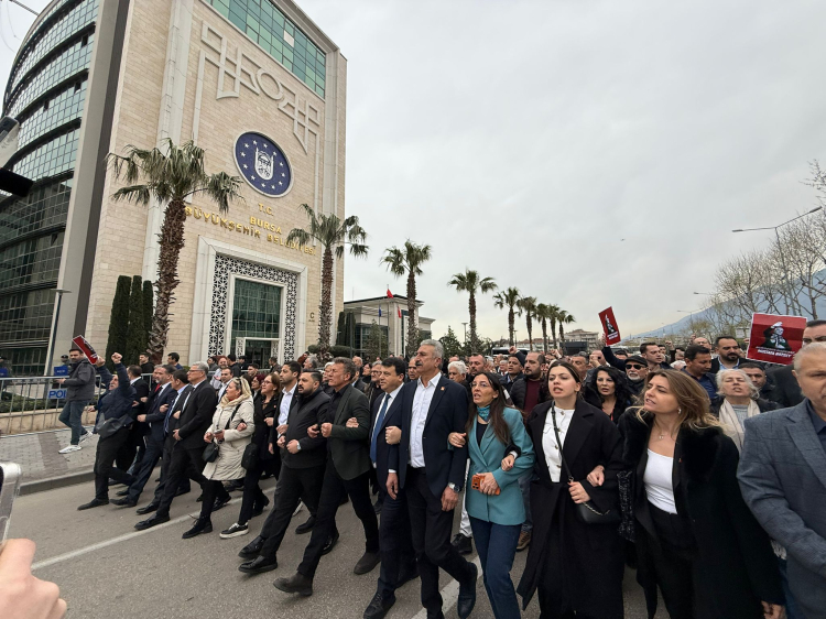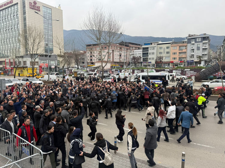 Bursa Büyükşehir Belediyesi binası önünde toplanan kalabalığa yönelik polis müdahalesinin ardından, CHP’li Bursa Büyükşehir meclis üyeleri ise meclis salonuna girmeme kararı aldı ve Ankara Yolu üzerinden il binasına doğru yürüyüş başlattı.