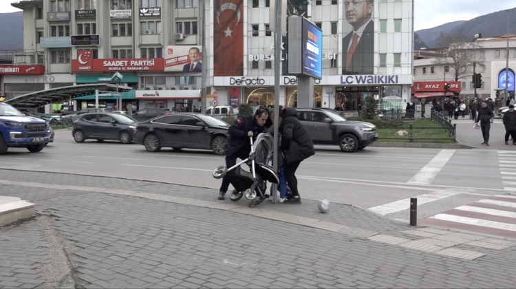 Bursa'da bebek arabası lodosla birlikte sürüklenerek devrildi