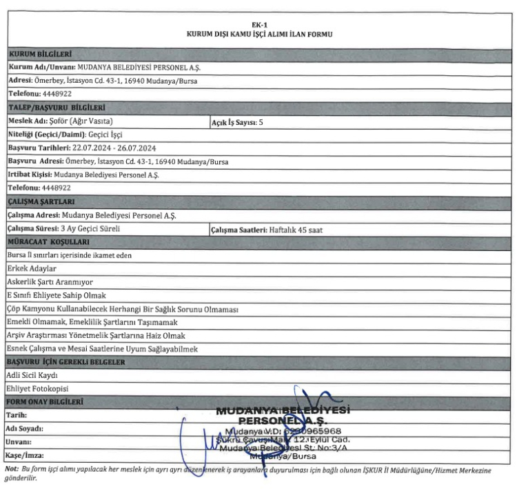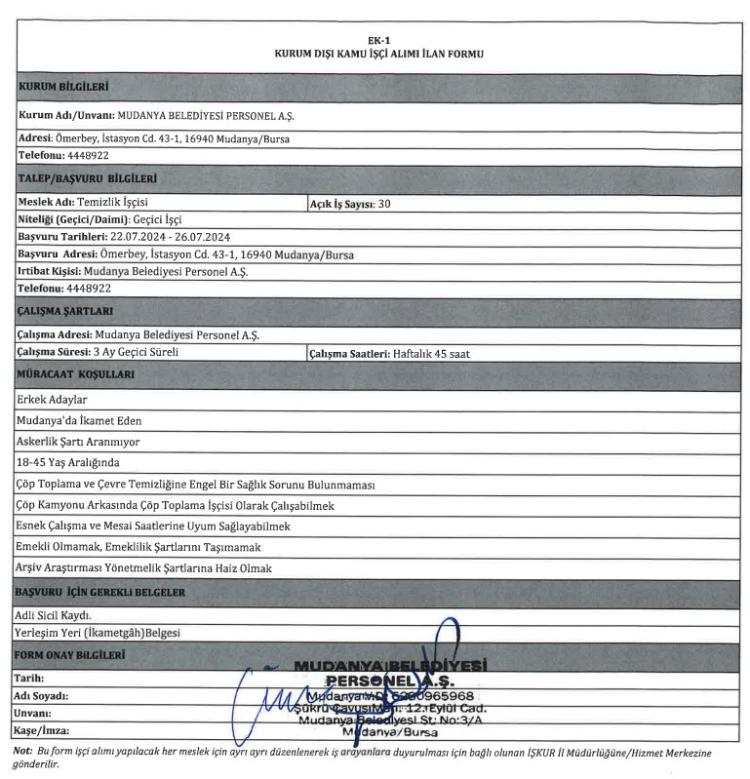 Mudanya Belediyesinin verdiği ilana göre; 30 temizlik işçisi ve 5 Şoför (Ağır Vasıta) istihdam edilecek.