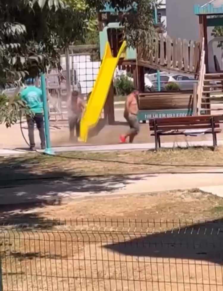 Bursa'da, belediye temizlik personeli, sıcak havada kaydırakta kayan çocukları elindeki hortumla su sıkarak serinletti. O anlar cep telefonuyla görüntülendi.
