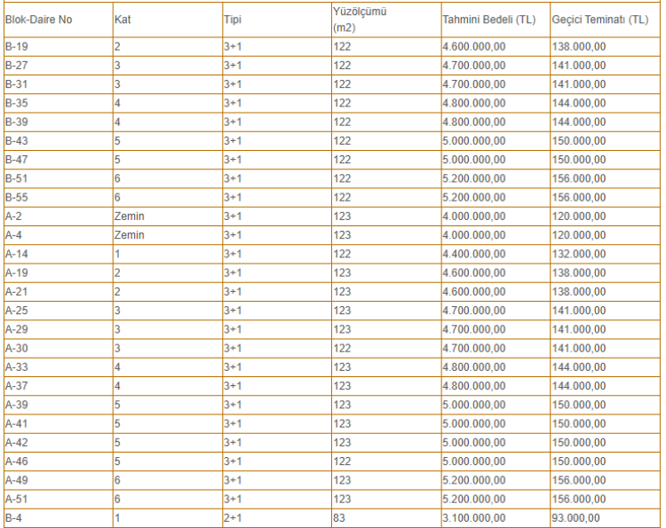 Dairelerin ihaleleri, 3 Kasım günü saat 12.00'de gerçekleştirilecek.