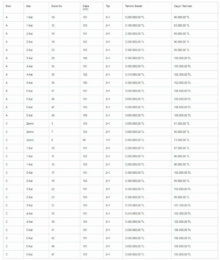 Dairelerin en ucuz 2 milyon 450 bin TL'den en pahalısı 3 milyon 650 bin TL'den kapalı teklif usulü ile satışa çıkarılacak.