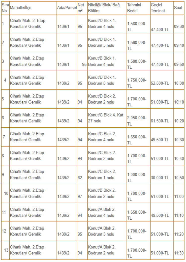 Gemlik Belediyesi, satışı yapılacak 13 dairenin Cihatlı Mahallesi'nde bulunduğunu bildirdi.