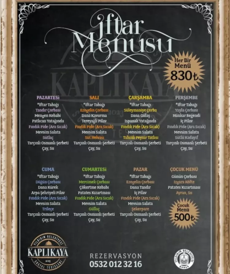 Yıldırım Belediyesi Kaplıkaya Sosyal Tesisleri’nde haftanın günlerine göre değişen iftar menüsü uygulaması başlatıldı.