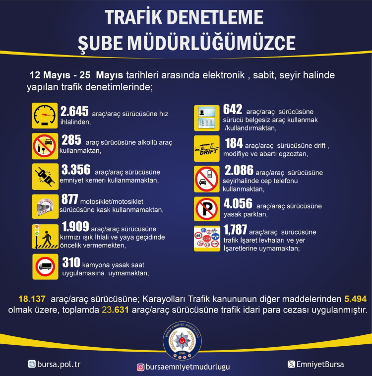 Bursa Emniyet Müdürlüğü tarafından yapılan paylaşımda 12 Mayıs- 25 Mayıs tarihleri arasında elektronik, sabit, seyir halinde trafik denetimleri gerçekleştirildiğini açıkladı.