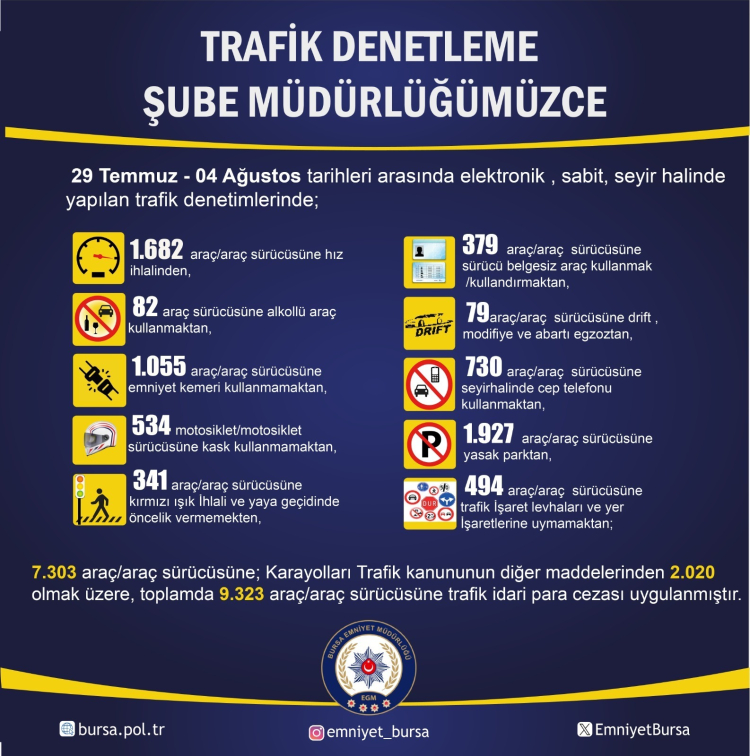 Bursa Emniyet Müdürlüğü sosyal medya hesabı üzerinden yaptığı paylaşımda 29 Temmuz-4 Ağustos tarihler arasında elektronik, sabit, seyir halinde trafik denetimleri gerçekleştirildiğini açıkladı.