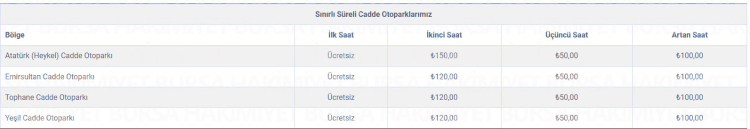 Atatürk (Heykel) (27 araç), Emirsultan (19 araç), Tophane (47 araç) ve Yeşil (14 araç) cadde otoparkları sınır süreli otopark olarak hizmet verecek.
