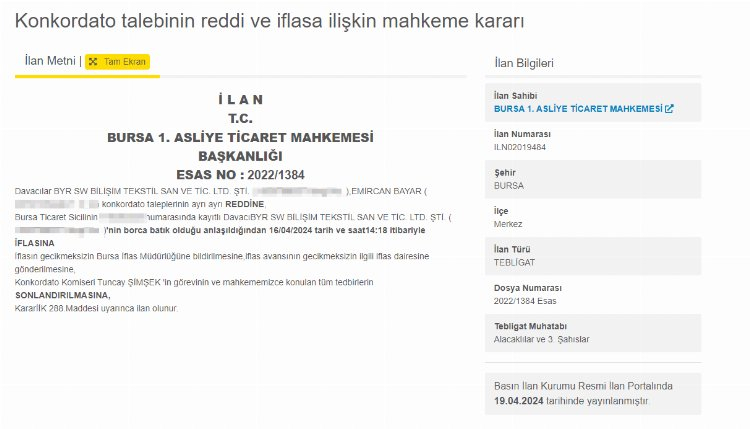 Bursa 1. Asliye Ticaret Mahkemesi'nin 16 Nisan 2024 tarihinde aldığı karar sonrası BYR SW Bilişim Tekstil Sanayi Ve Ticaret Limited Şirketi adlı firmanın konkordato taleplerinin ayrı ayrı reddedildiği duyurdu.
