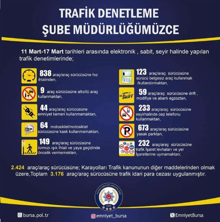 Bursa'da geçtiğimiz hafta elektronik, sabit ve seyir halinde yapılan trafik denetimlerinde 3 bin 176 araç ve araç sürücüsüne para cezası verildi.