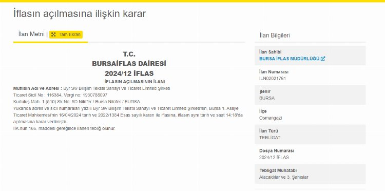 Bursa İflas Dairesi tarafından yayımlanan duyuruda, Byr Sw Bilişim Tekstil Sanayi Ve Ticaret Limited Şirketi'nin, Bursa 1. Asliye Ticaret Mahkemesi'nin 16/04/2024 tarih ve 2022/1384 Esas sayılı kararı ile iflasına ve iflasın aynı tarih ve saat 14.18'de açılmasına karar verildi.
