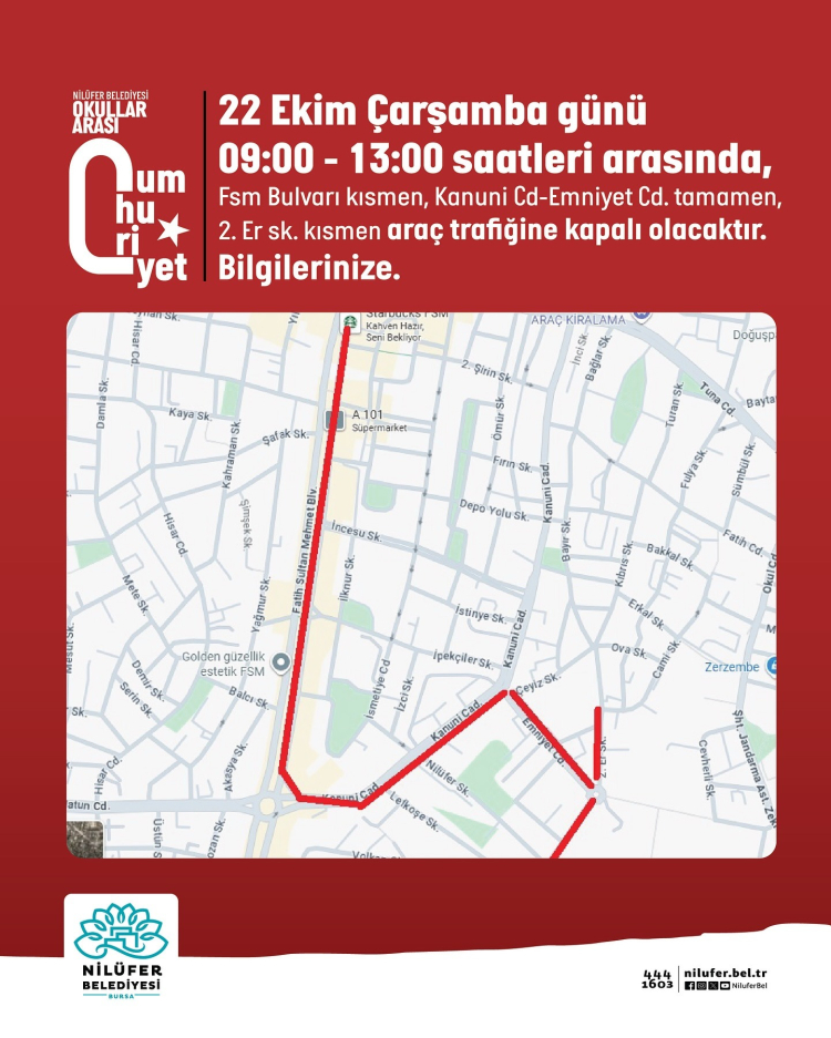 Bursa Nilüfer Belediyesi, 22 Ekim Çarşamba günü gerçekleştirilecek Okullar Arası Cumhuriyet Koşusu dolayısıyla bazı güzergâhların geçici olarak trafiğe kapatılacağını duyurdu.