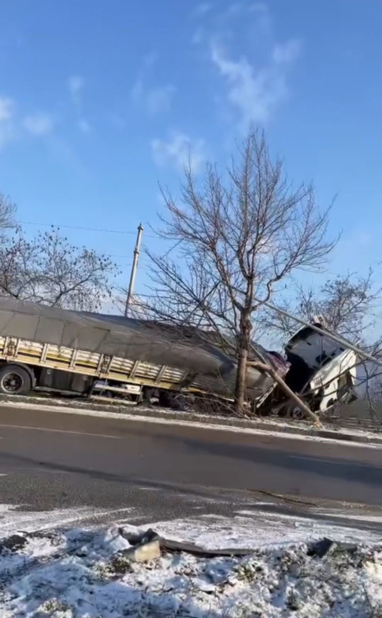 Edinilen bilgiye göre, sabah saatlerinde hava sıcaklığı -3 dereceyi görürken, yolda meydana gelen buzlanma nedeniyle S.Ş. idaresindeki 33 YBZ 74 plakalı tırın kontrolünü kaybetti.