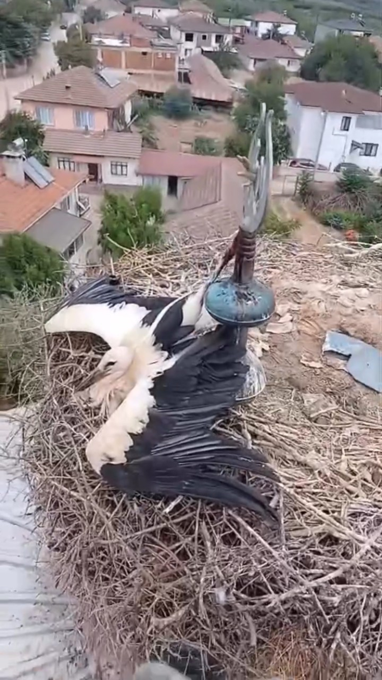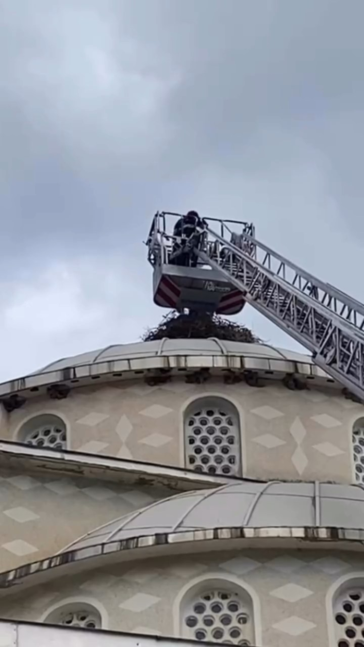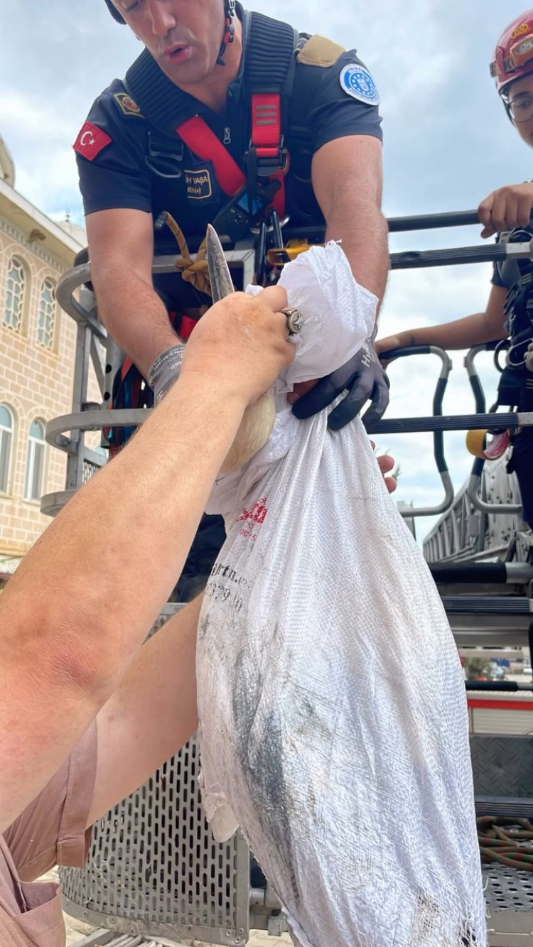Orhaniye Mahallesi Muhtarı Mehmet Duman, dün bir leyleğin yuva kurduğu caminin kubbesinde ayağının aleme sıkıştığını fark edip durumu itfaiyeye bildirdi. Gelen ekipler, ayağının kırıldığı tespit edilen leyleğe ulaşamayınca merdiveni 54 metreye kadar uzanan kurtarma aracı çağrıldı. Ancak yuvaya yaklaştığı sırada, aracın merdiveni kırılarak ikiye ayrıldı.