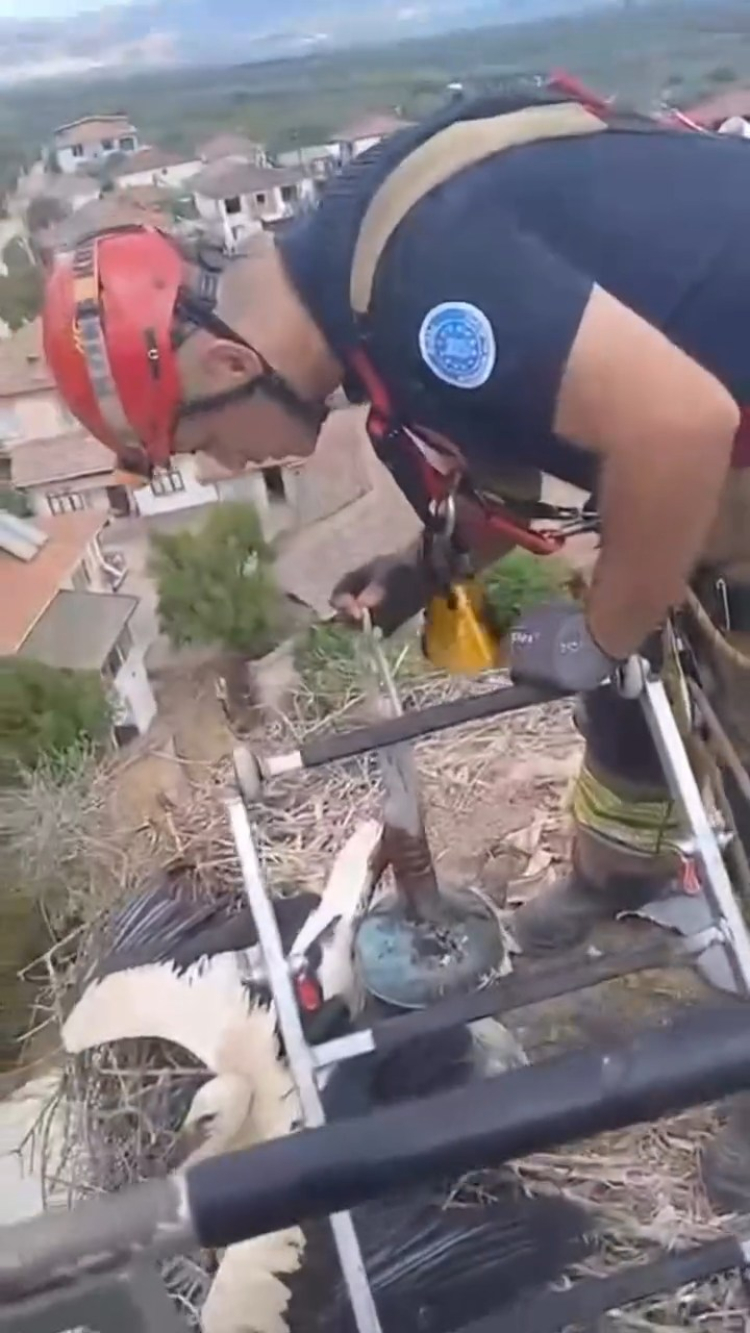 Görüntülerde, cami kubbesinin üstüne yuva yapan leyleğin ayağının, aleme sıkıştığı görüldü. Beline kurtarma halatını bağladıktan sonra sepetten kubbenin üstüne inen itfaiye erinin, sıkışan ayağını kurtardığı leyleği bir çuvalın içine koyarak aşağı indirdiği anlar görüntülere yansıdı.