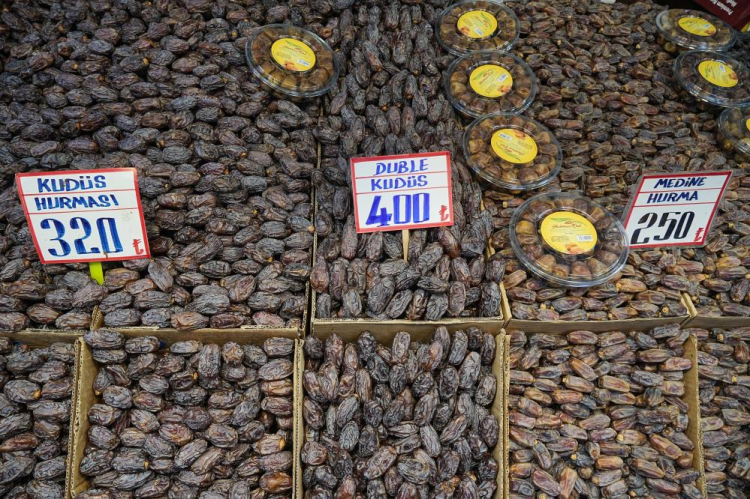 Kilosu 200 ile 400 lira arasında değişen hurma, 15 çeşidiyle tezgahları süsledi. İftar ve sahur alışverişi yapmak için çarşıya akın eden insanlar kapalı çarşı esnafının yüzünü güldürdü.