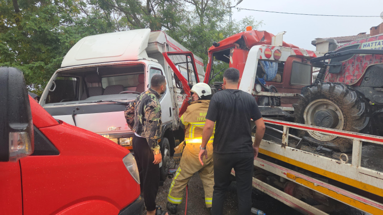 Bursa’nın Orhangazi ilçesinde Orhangazi-İznik Güney yolu Gölyaka mahallesi virajında meydana gelen trafik kazasında traktör taşıyan bir çekici ile kamyonet çarpıştı. Kazada 4 kişi yaralanırken, çekicinin sürücüsü araç içinde sıkıştı. Çekici sürücüsü itfaiye ekiplerinin yaklaşık 20 dakikalık çalışması sonrasında çıkarılarak hastaneye kaldırıldı.