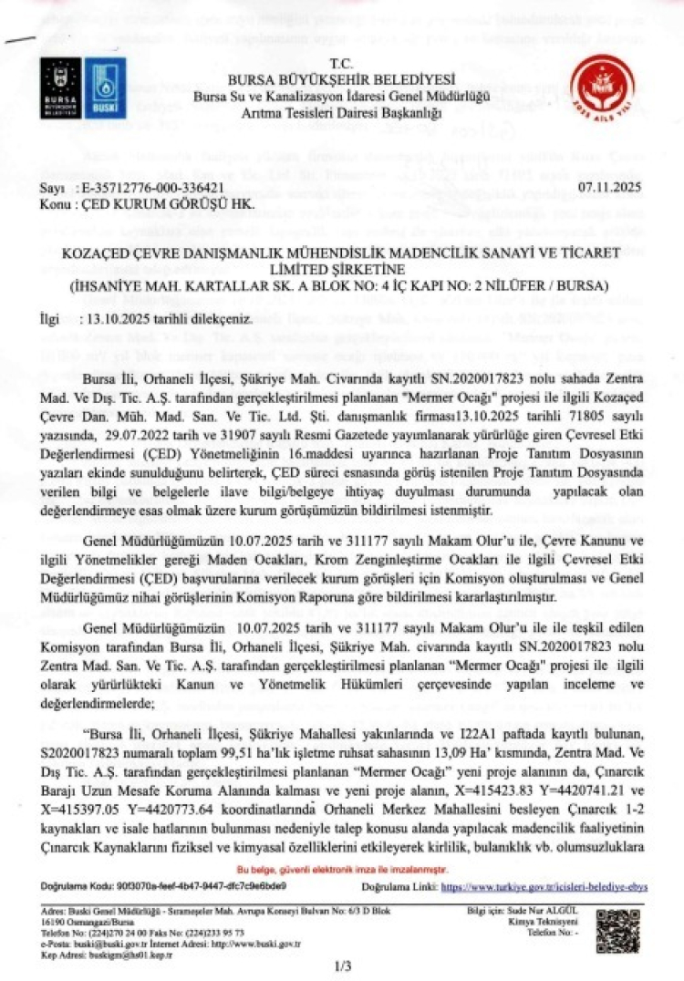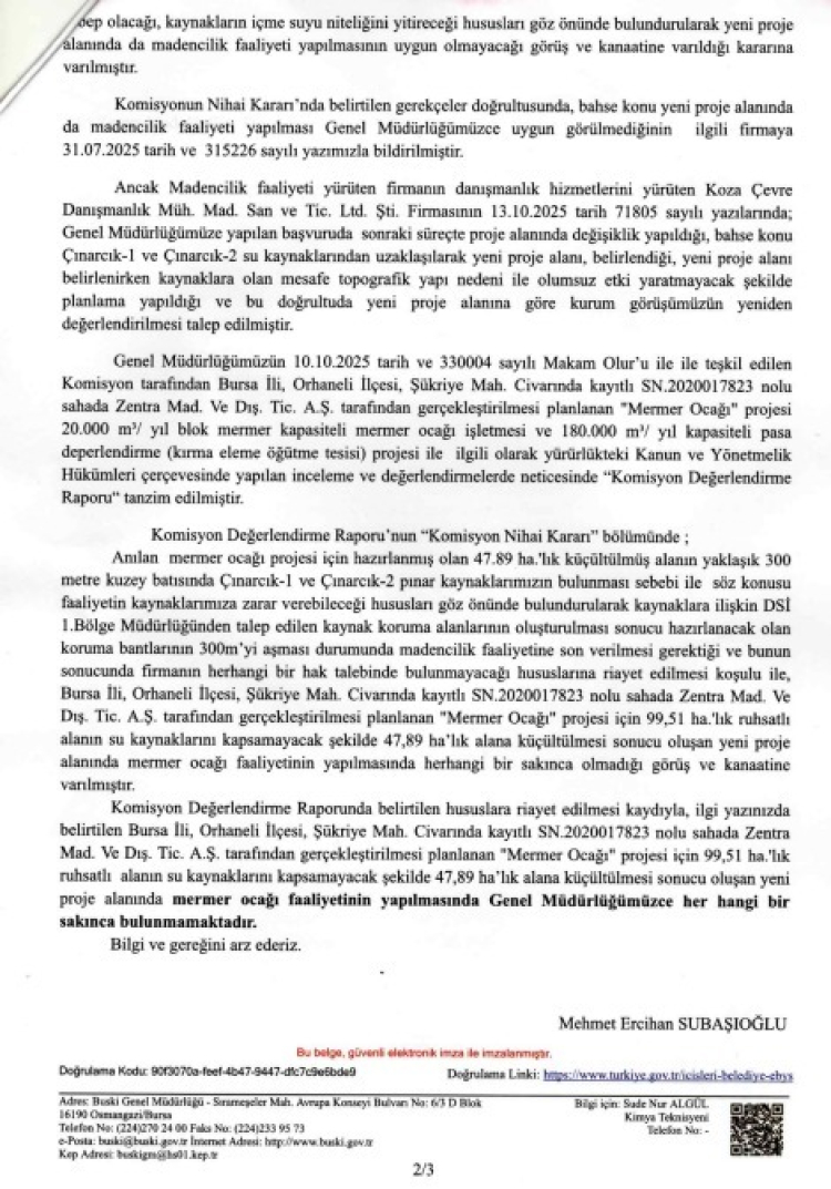BUSKİ'den yapılan açıklamada, "Anılan mermer ocağı projesi için hazırlanmış olan 47.89 ha.'lık küçültülmüş alanın yaklaşık 300 metre kuzey batısında Çınarcık-1 ve Çınarcık-2 pınar kaynaklarımızın bulunması sebebi ile söz konusu faaliyetin kaynaklarımıza zarar verebileceği hususları göz önünde bulundurularak kaynaklara ilişkin DSİ 1.Bölge Müdürlüğünden talep edilen kaynak koruma alanlarının oluşturulması sonucu hazırlanacak olan koruma bantlarının 300m’yi aşması durumunda madencilik faaliyetine son verilmesi gerektiği ve bunun sonucunda firmanın herhangi bir hak talebinde bulunmayacağı hususlarına riayet edilmesi koşulu ile Bursa İli, Orhaneli İlçesi, Şükriye Mahallesi civarında kayıtlı SN.2020017823 nolu sahada Zentra Madencilik ve Dış Ticaret Anonim Şirketi tarafından gerçekleştirilmesi planlanan "Mermer Ocağı" projesi için 99,51 ha.'lık ruhsatlı alanın su kaynaklarını kapsamayacak şekilde 47,89 ha'lık alana küçültülmesi sonucu oluşan yeni proje alanında mermer ocağı faaliyetinin yapılmasında herhangi bir sakınca olmadığı görüş ve kanaatine varılmıştır." ifadeleri kullanıldı.
