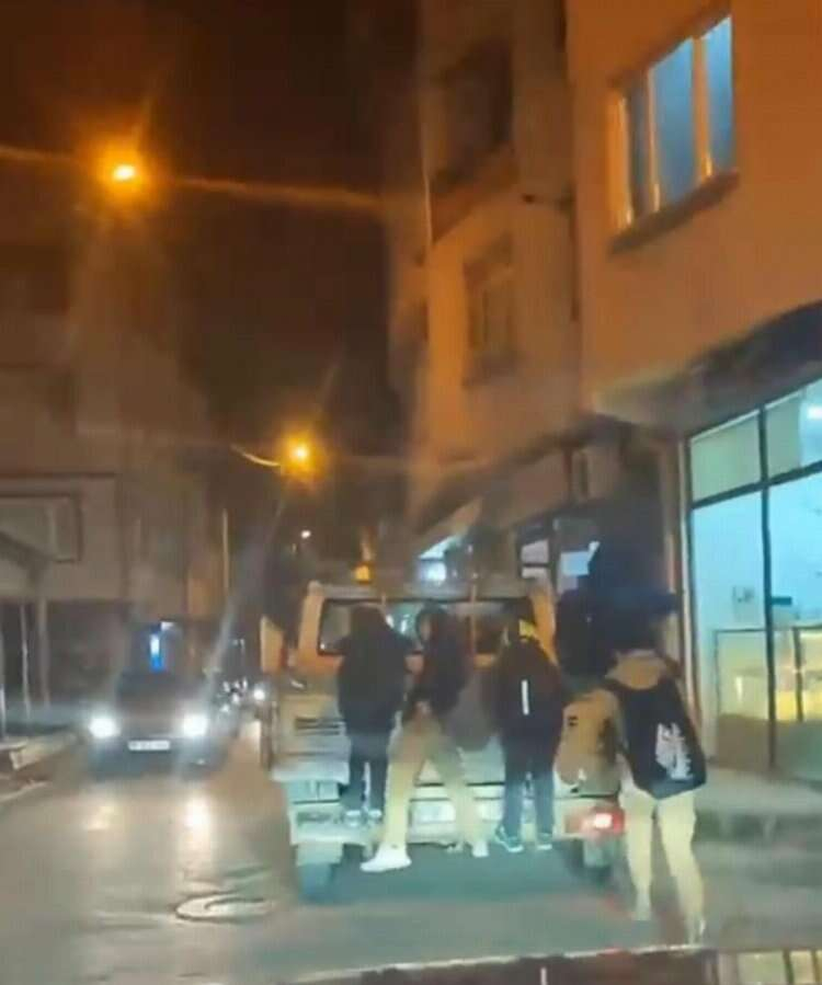Bursa’da açık kasa bir kamyonetin arkasına asılarak yolculuk yapan çocukların tehlikeli yolculuğu kameraya yansıdı.