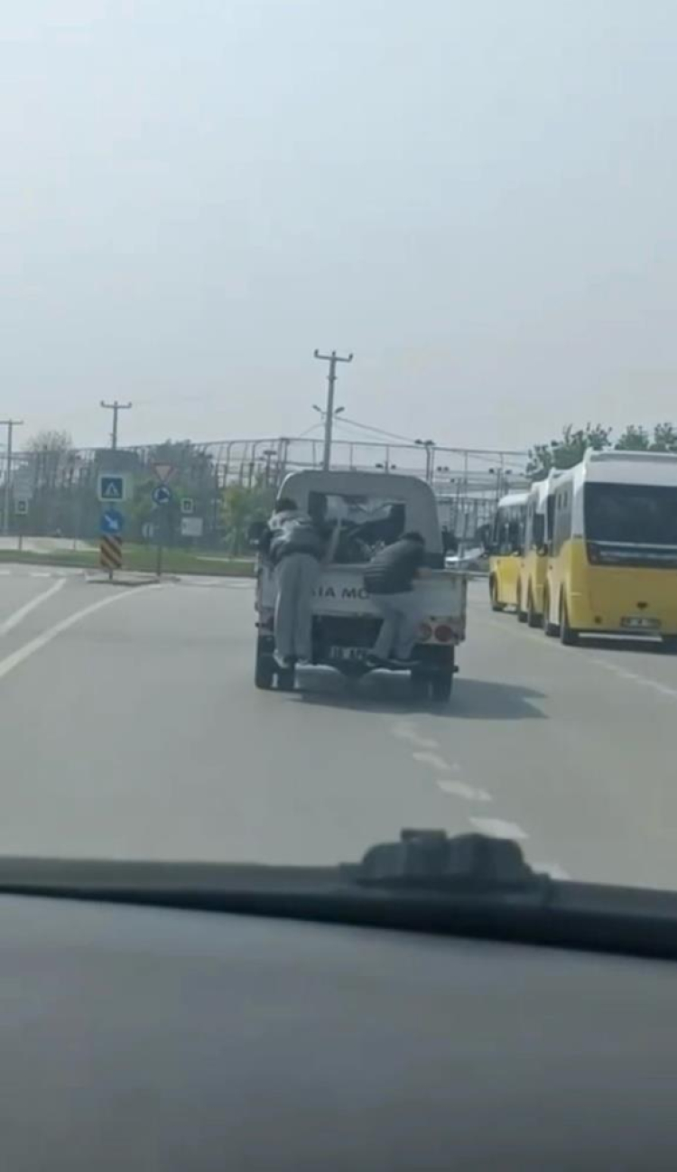 Bursa'da 2 gencin kasalı kamyonet arkasındaki tehlikeli yolculuğu kameraya yansıdı.