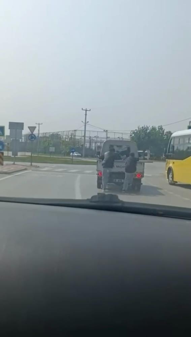 Canlarını hiçe sayan 2 genç, kasalı kamyonetin arkasına tutunarak ilerlemeye başladı.