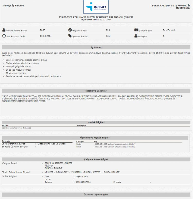 Bursa Şehir Hastanesi'nde çalışacak özel koruma ve güvenlik personeli arayan şirket an az lise mezunu kriteri olması gerektiğini belirtti.