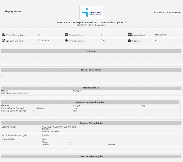Şirket mobilya imalathanesinde çalışacak 11 adet personel alacağını belirtirken eğitim seviyesininin en az ilköğretim olması gerektiğini açıkladı.