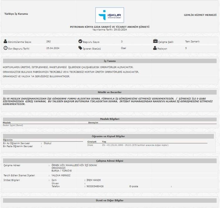 Şirket hortumların üretimi, istiflenmesi, paketlenmesi işlerinde çalışacak beden işçilerinin ilkokul mezunu olması gerektiği açıkladı.