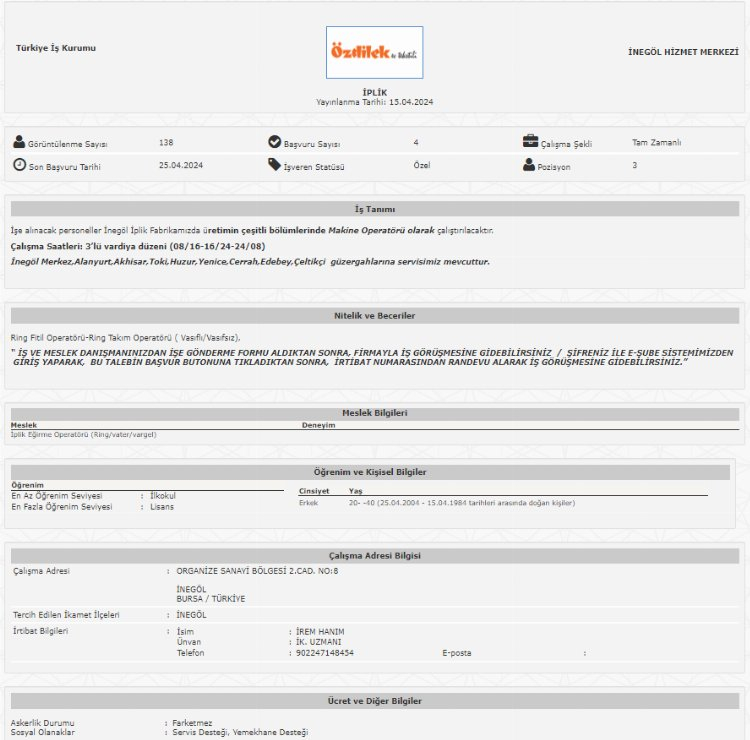 İnegöl İplik Fabrikasında çalışacak Makine Operatörü alınacağını belirten şirket en az eğitim seviyesinin ilkokul olması gerektiğini açıkladı.