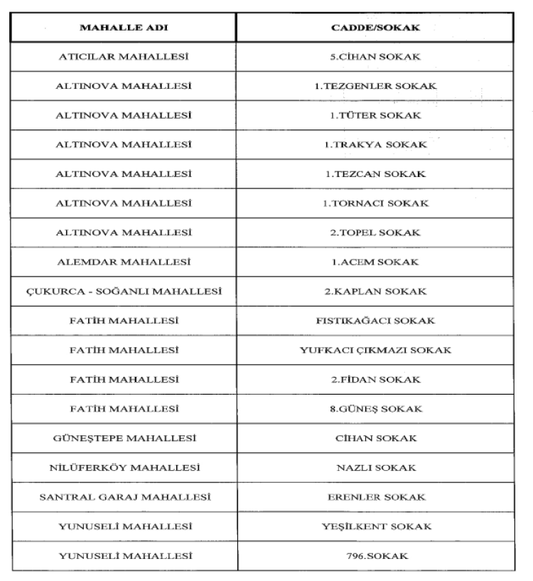 Meclis Başkanı Erkan Aydın ile Divan Kâtipleri Ali Metin ve Özge Kaya tarafından imzalanan karar doğrultusunda, listede yer alan sokaklar resmi olarak sokak statüsünden çıkarıldı.