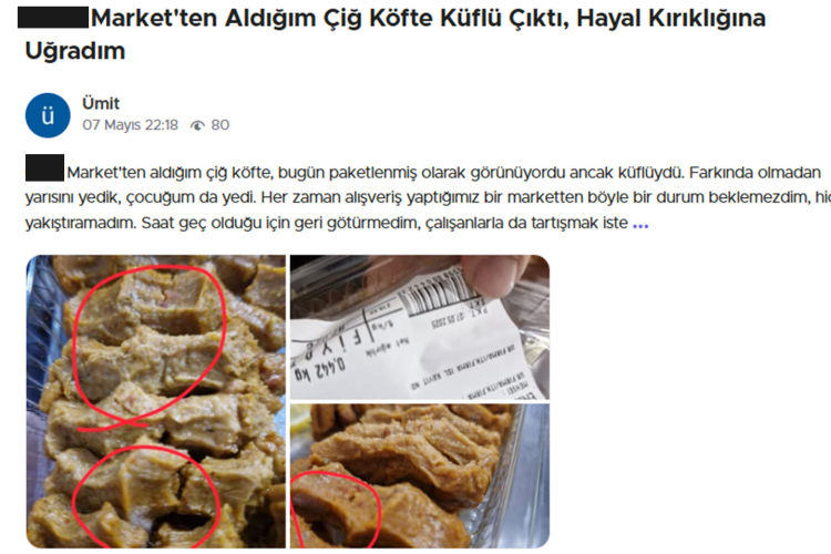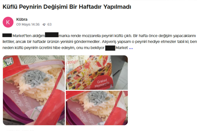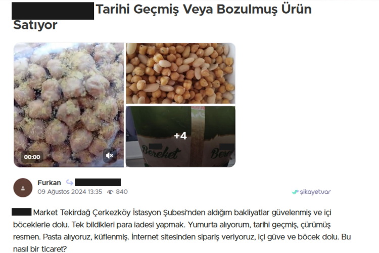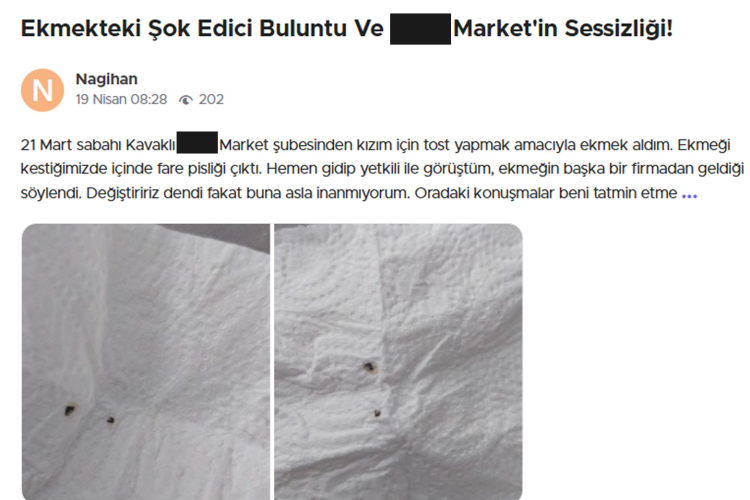 Firmaya; güvelenmiş ve böceklenmiş bakliyat, küflü peynir, küflü çiğköfte, bozuk sebze-meyve sattığı iddiasıyla şikayetler yağarken bir müşteri de ekmekten fare pisliği çıktığını öne sürdü.
