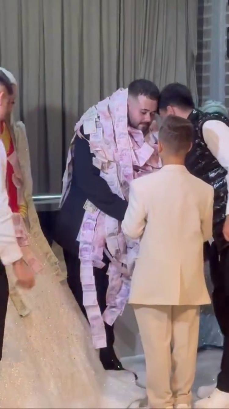 Beyda ve Enes çiftinin mutlu gününde takı merasiminde salona getirilen metrelerce uzayan para şeridi davetlilerin dikkatini çekti.