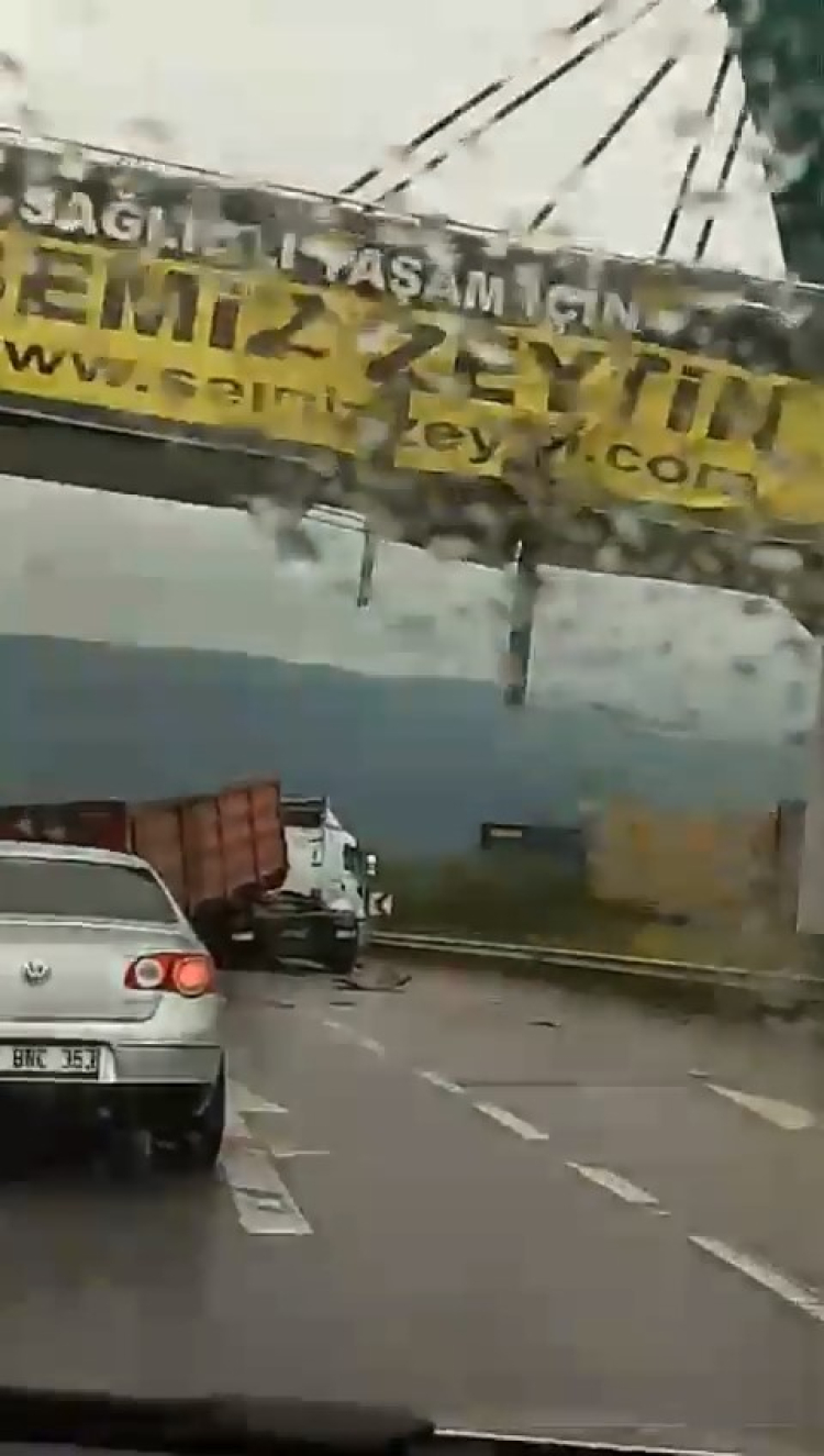 Bursa'nın Gemlik ilçesinde seyir halindeki tırın damperi açılarak üst geçide çarptı. Kaza sonrası trafik tek şeritten ilerlerken, tır çekici yardımıyla yoldan kaldırıldı.