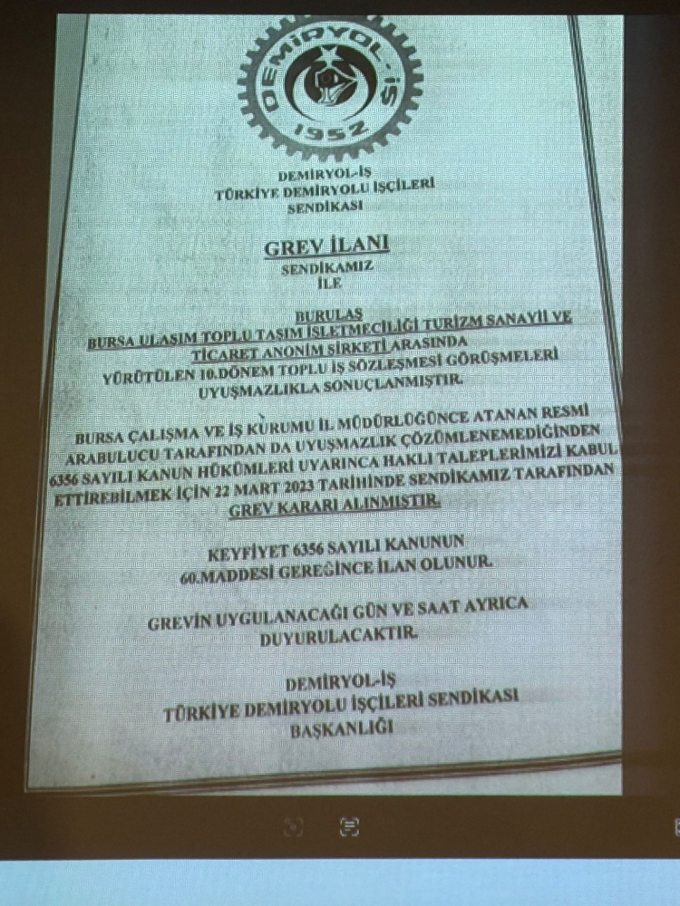 Türk Demiryol - İş Sendikası (Demiryol-İş), Bursa Büyükşehir Belediyesi iştirakilerinden BURULAŞ işyerinde çalışmakta olan 2 bin 800 işçiyi ilgilendiren Demiryol-İş sendikası ve Sodemsen işveren sendikası arasında sürüdülen 11.Dönem Toplu İş sözleşmesi görüşmelerinin yasal süre içerisinde tamamlandığını 20 Mayıs’ta grev kararı aldıklarını açıkladı.