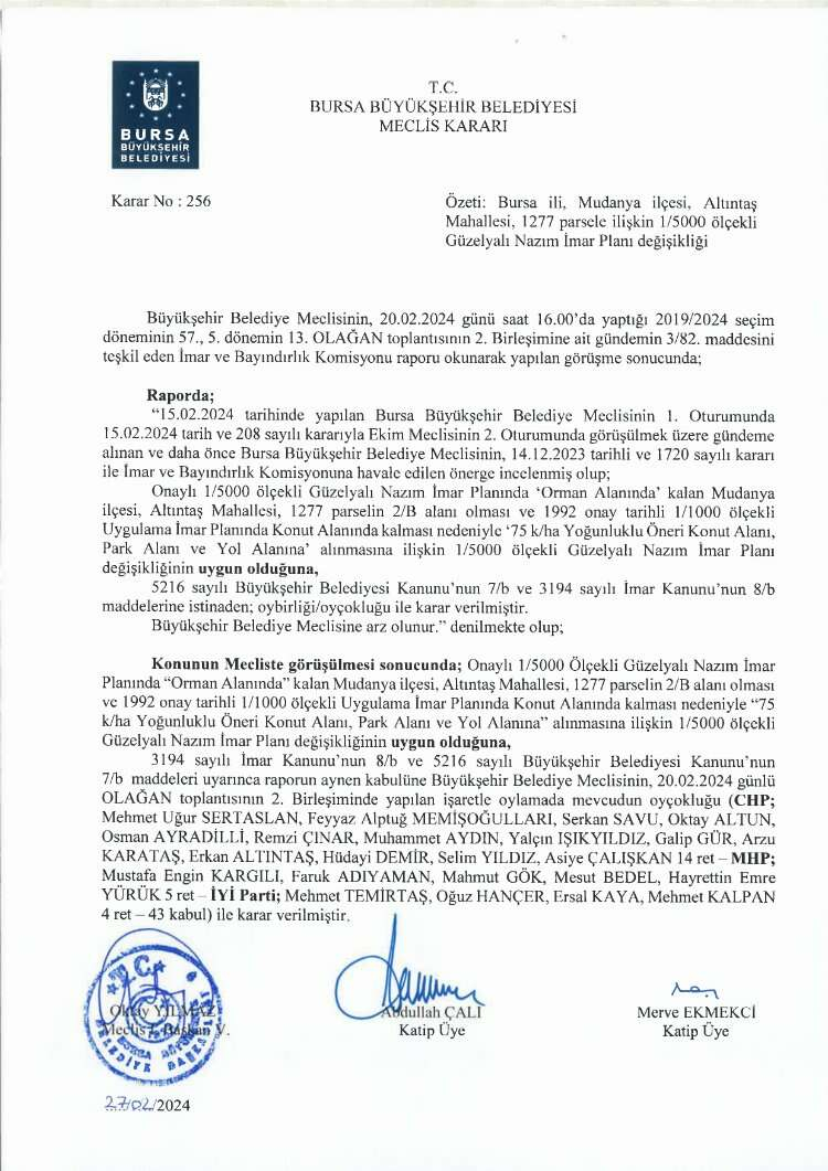 İmar ve Bayındırlık Komisyonu'na hava edilen önergeyi inceleyen Belediye Meclisi, 1/5000 ölçeki Güzelyalı Naızm İmar Planı'nda 'Orman Alanın'da kalan Mudanya ilçesi, Altıntaş Mahallesi, 1277 parselin 2/B alanı olması ve 1992 onay tarihli 1/1000 ölçekli Uygulama İmar Planında konut alanında kalması nedeniyle '75 k/ha Yoğunluklu Öneri Konut Alanı, Park Alanı ve Yol Alanına' alınmasına ilişkin 1/500 Güzelyalı İmar Planı değişikliğinin uygun olduğuna karar verdi.