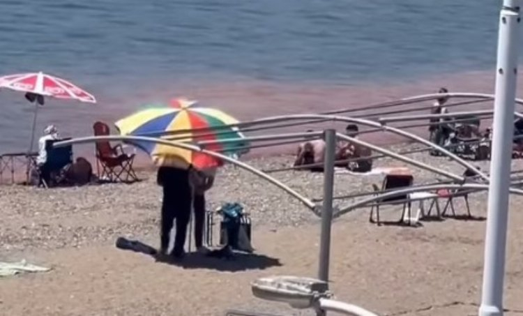 Hafta sonunu fırsat bilerek soluğu plajlarda alan vatandaşlar, güneşin yakıcı ve bunaltıcı havasından sıkılın alg patlamasının rengini değiştirdiği denize girdi.