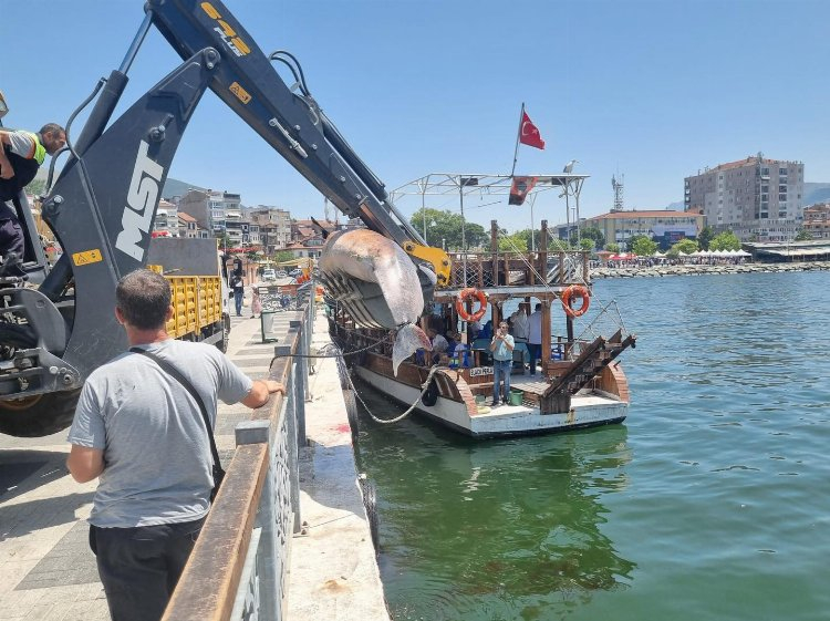 Bursa'nın Gemlik ilçesinde dip ve kıyı temizliği programında Gemlik Körfezi'nden 3 metrelik cansız yunus balığı çıkartıldı.