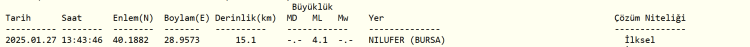Bursa’da öğle saatlerinde şiddetli bir deprem meydana geldi. Merkez üssü Nilüfer olan depremin büyüklüğü AFAD tarafından 4 olarak açıklanırken Kandilli Rasathanesi ise 4.1 olarak açıkladı.