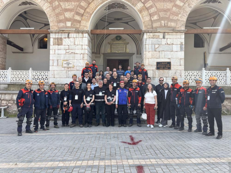 Bursa'da 6 Şubat Depremlerinin Kültürel Miras Üzerindeki Etkilerinin Değerlendirilmesi Çalıştayı kapsamında, Birinci Murad Hüdavendigar Külliyesi'nde deprem tatbikatı gerçekleştirildi.