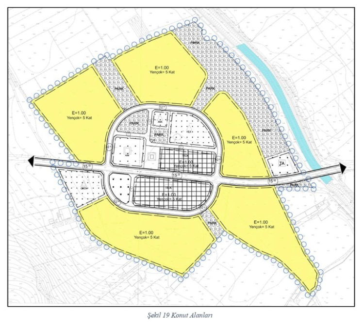 Proje kapsamında: Konut ve ticaret-konut bölgelerinde 150 kişi/hektar yoğunluk öngörüldü.