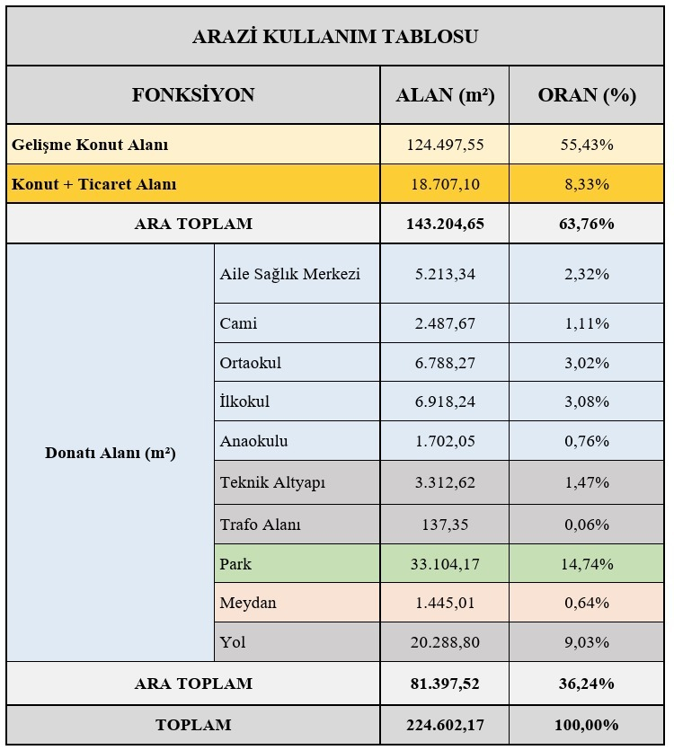 Planlanan nüfus 3 bin 369 kişi, Alanın %36,24’ü donatı alanı, 3 eğitim alanı, 1 ibadet alanı, 1 sağlık tesisi, 15 ve 12 metrelik yollar tasarlandı.