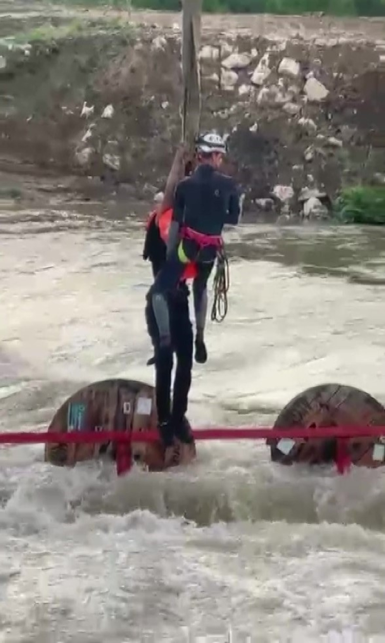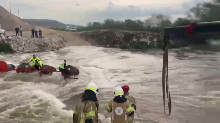 Bursa'da dereyi traktörle geçmek isteyen 10 işçi, aracın devrilmesiyle mahsur kaldı. İşçiler ekiplerin vinç destekli çalışmasıyla kurtarıldı.