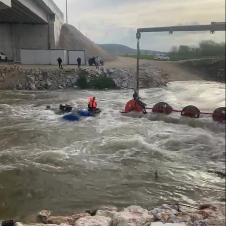 Bursa’nın Yenişehir ilçesinde Kocasu Deresi’nden traktörle karşıya geçmek isteyen 10 işçinin bulunduğu traktör, suyun ortasında devrildi. Akıntının etkisiyle dengesini kaybeden traktördeki işçiler dere içinde mahsur kaldı.