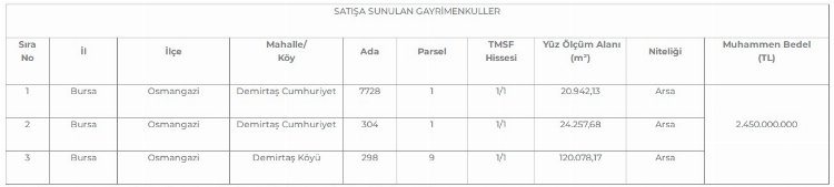 Tasarruf Mevduatı Sigorta Fonu (TMSF), Bursa’nın Osmangazi ilçesindeki toplam 165 bin metrekareden fazla büyüklüğe sahip üç arsayı 2 milyar 450 milyon TL'den satışa çıkardı. İşte o arsalar...