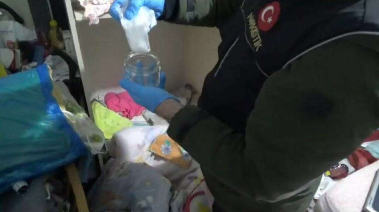 Narkotik köpeğinin de katıldığı kapıların koçbaşlarıyla kırıldığı operasyonda yüklü miktarda uyuşturucu, hassas teraziler, 13 tabanca ve fişekler ele geçirildi.