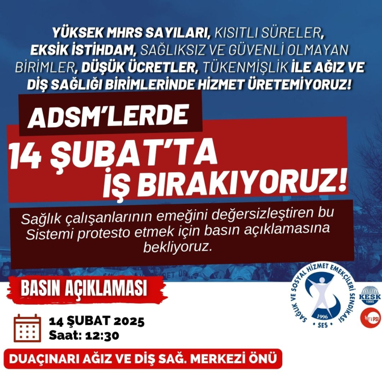 Ağız ve Diş Sağlığı Merkezleri (ADSM), Ağız ve Diş Sağlığı Hastaneleri (ADSH) ve devlet hastanelerinde görev yapan diş hekimleri, artan iş yükü ve mesleki sorunlara dikkat çekmek amacıyla 14 Şubat 2025 tarihinde iş bırakma kararı aldı.